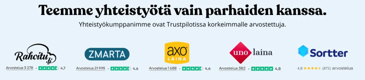 Lainavertailupalveluiden tarjoamisen yhteydessä sivustomme tekee yhteistyötä Sortter Oy:n, Sambla Group Oy:n sekä Axo Finance Oy:n (AxoLaina ja Zmarta) kanssa. Kukin näistä toimii itsenäisenä rekisterinpitäjänä omien palveluidensa osalta. Lisätietoja henkilötietojen käsittelystä ja palveluiden käyttöä koskevista ehdoista löytyy heidän tietosuojaselosteistaan ja käyttöehdoistaan seuraavien linkkien kautta: